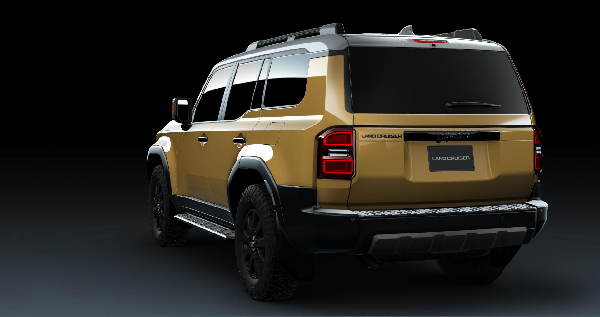 At the rear, the Prado features a vertically oriented tailgate and simple tail-light signature to complement the front end, with silver lower bumpers at both the front and rear of the vehicle.