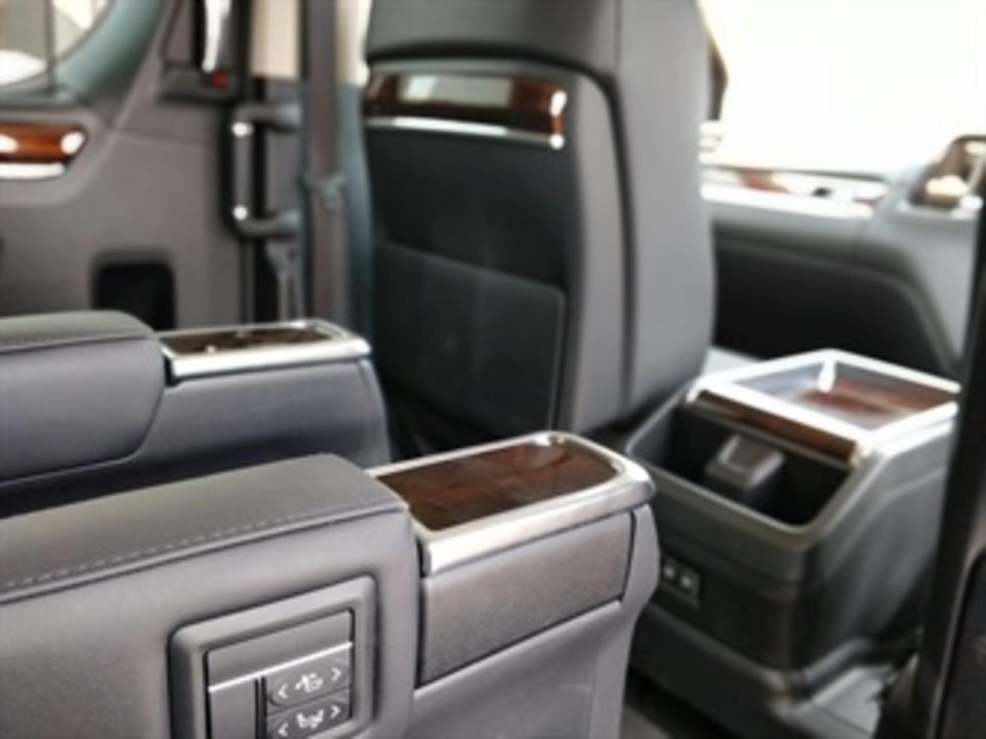 It's the passenger that's really in the spotlight in the Granvia. You get in through the one of the double sliding doors and find not seats, but lounge chairs waiting for you. Especially in the top-shelf VX version they are lush, with nicely stitched leather, woodgrain and an even more upperclass name: captain chairs. Powered and heated, with ottomans. This only goes for the first row though, the second (and optional third) row have to do with 'plain' leather seats. With room for six passengers there is plenty for everyone, even when moving the seat all the way to the back and extending the footrest. In the 8-seater version it all becomes a bit more crowded and you lose most luggage space, but you can still make everybody fit comfortably.