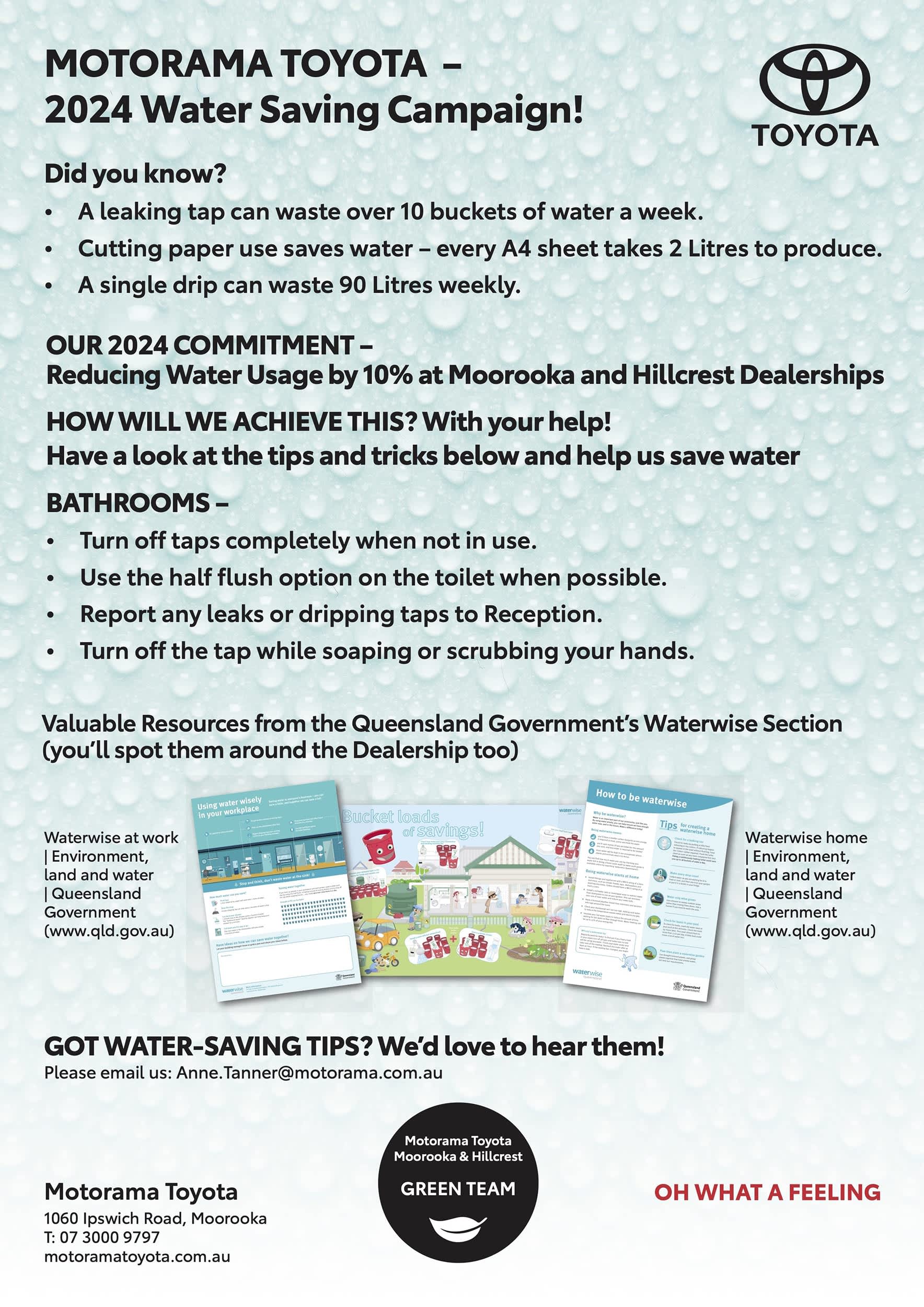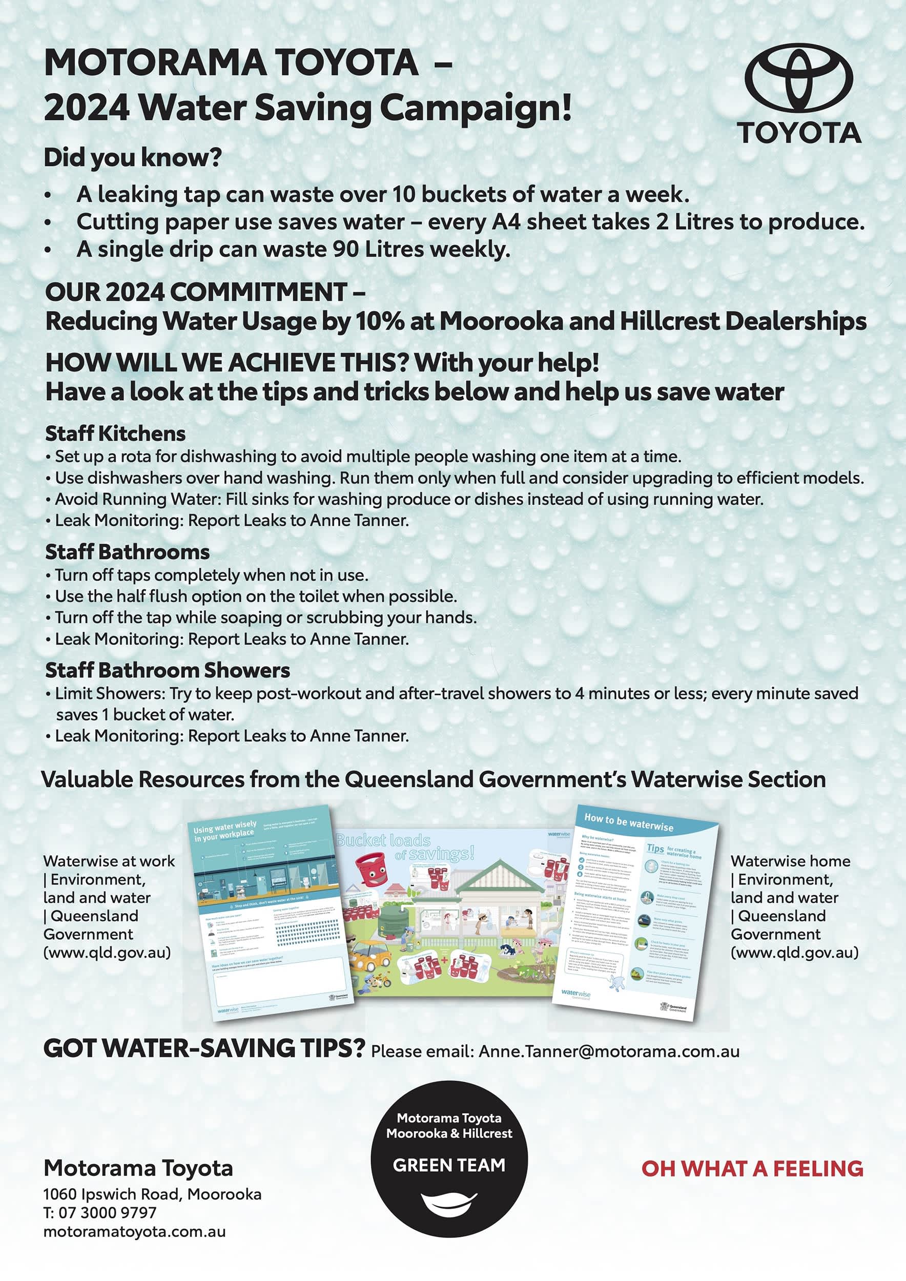 Posters featuring tips and best practices from Waterwise Queensland will be displayed in staff areas, reminding everyone of the importance of saving water.
